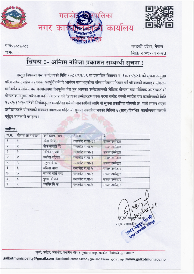अन्तिम नतिजा प्रकाशन सम्बन्धी सूचना ।