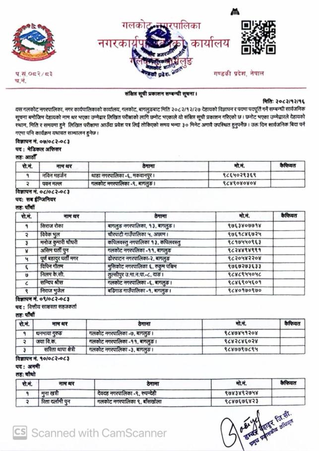 संक्षिप्त सूची प्रकाशन सम्बन्धी सूचना ।
