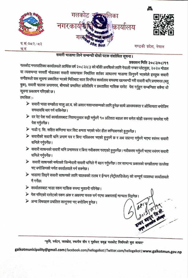 सवारी भाडामा लिने सम्बन्धी दोस्रो पटक संशोधित सूचना ।