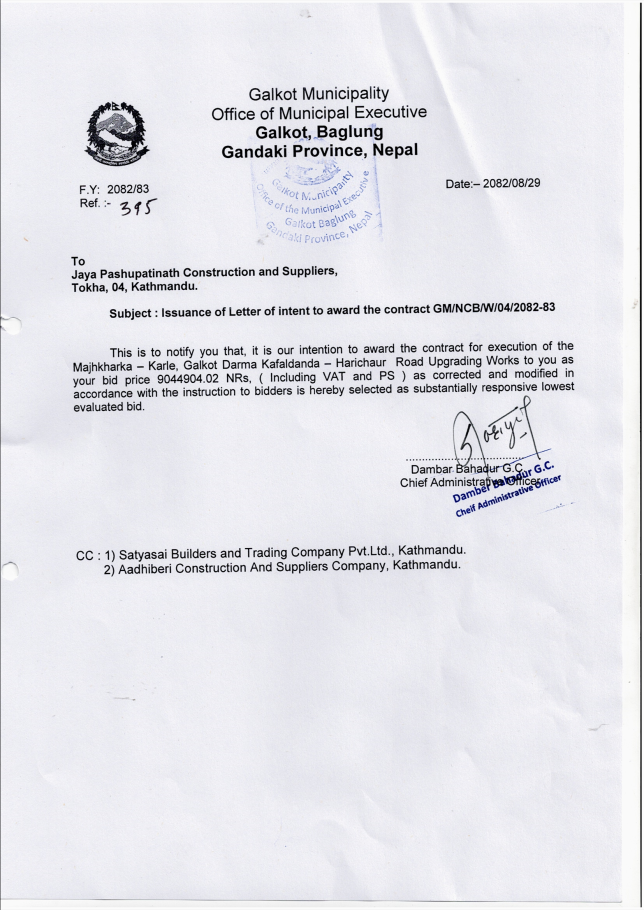 Issuance of letter of intent to award the contarct GM/NCB/G/02/2082-83