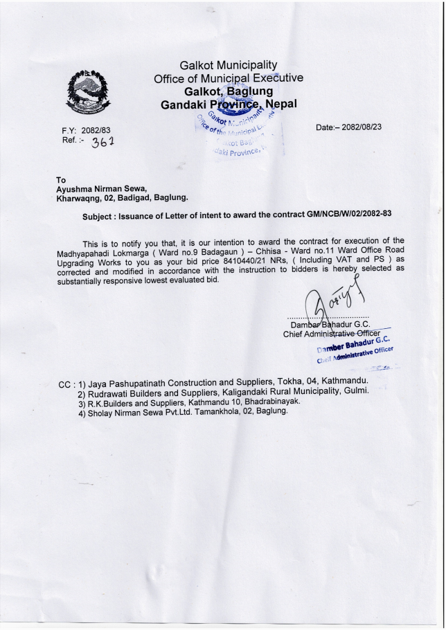 बोलपत्र स्वीकृत गर्ने आशयको सुचना।